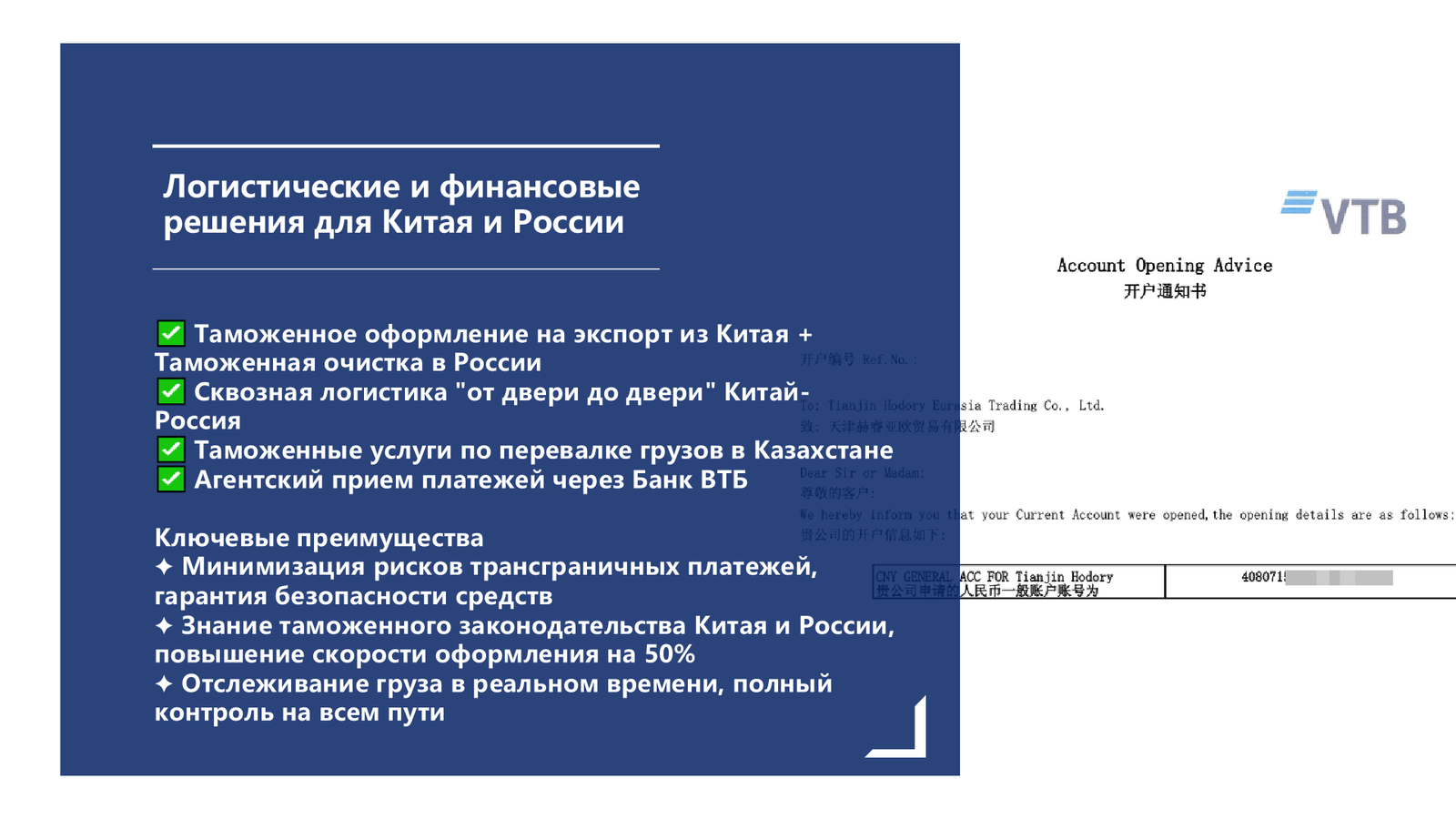 Финансовые услуги для китайско-российской торговли: Благодаря партнерским отношениям с банком ВТБ, мы обеспечиваем безопасные и эффективные каналы для проведения торговых расчетов между Китаем и Россией.